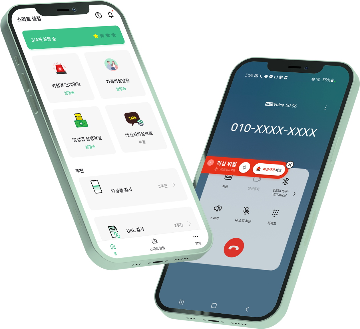 스마트피싱보호는 빅데이터 분석으로 예측된 최신/주요 피싱정보를 주기적으로 제공하여 변화하는 피싱사기를 미리 알고 예방할 수 있도록 돕고 있습니다. 피싱 의심전화와 장시간 통화 시 제공되는 단계별 알림 등 다양한 방법으로 나와 소중한 가족이 피싱사기 피해로부터 보호받을 수 있습니다.
