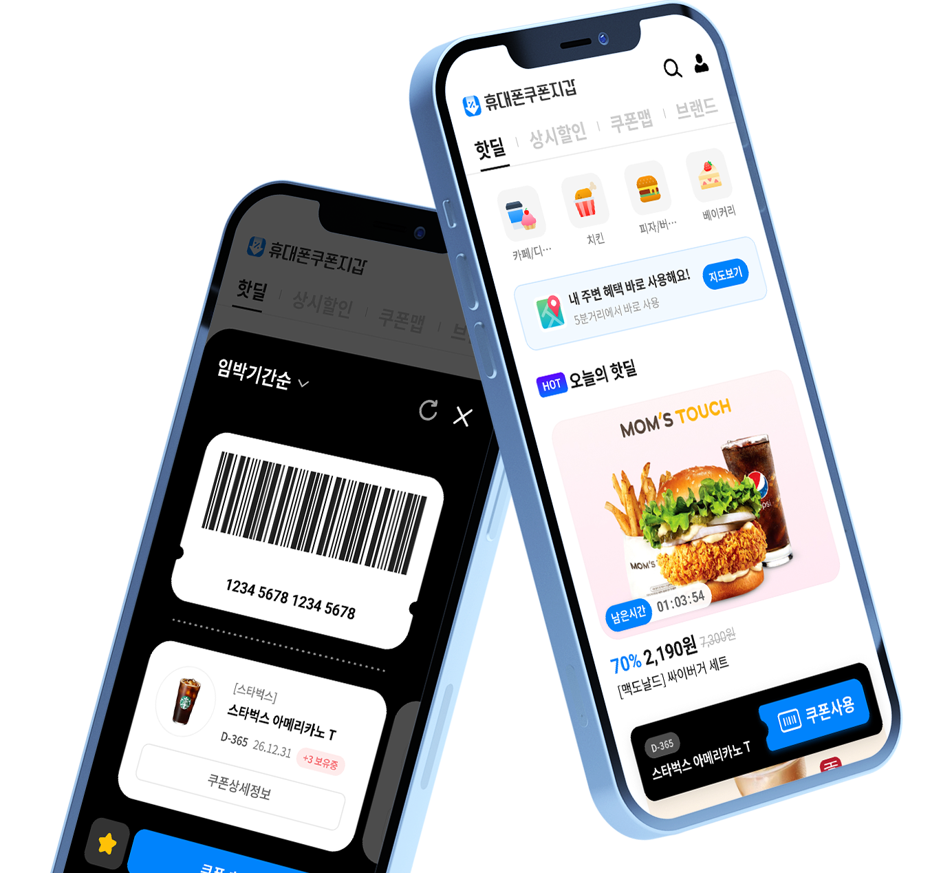 휴대폰쿠폰지갑은 모바일 쿠폰을 스마트하게 관리하고, 시중가보다 저렴하게 제공하여 알뜰한 소비를 돕는 서비스 입니다. 소비자는 언제, 어디서든 원하는 제품을 할인된 가격에 합리적으로 구매하고, 서비스에서 구매한 쿠폰과 선물 받은 쿠폰까지 한곳에 모아 간편하게 사용할 수 있습니다.