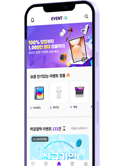 이벤트유(EventU)는 놓치기 쉬운 다양한 이벤트를 모아 제공합니다. 갖고 싶은 상품이 있다면 관심 경품으로 등록하고, 관련 이벤트 알림을 받을 수 있습니다. 이벤트를 등록하거나 참여하면 포인트가 적립되며, 적립된 포인트로 행운의 경품에 응모할 수 있습니다. 앱에서 쉽고 간편하게 참여하고, 경품 당첨의 기회를 노릴 수 있습니다.