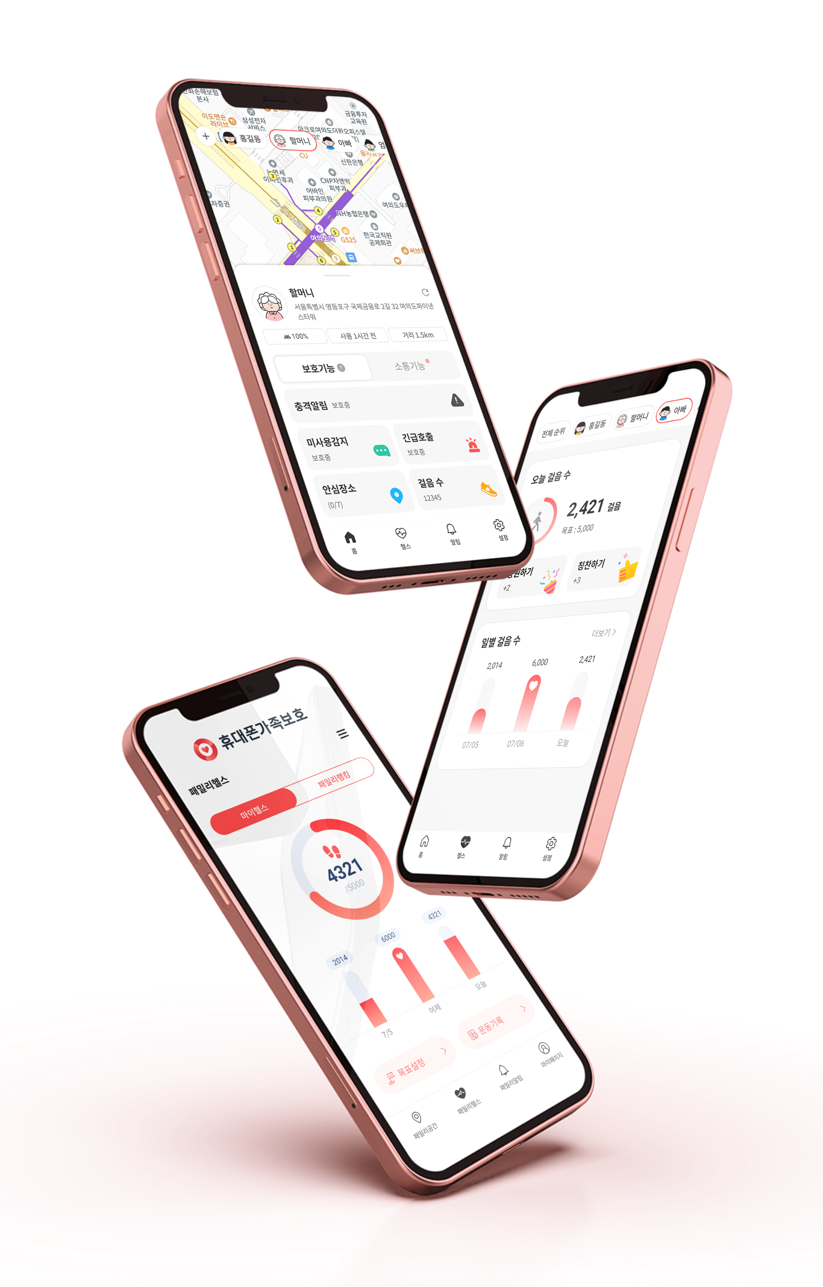 항상 소지하고 있는 휴대폰 데이터를 기반으로 구성원을 연결하고 소통을 도와 서로의 안위를 확인합니다. 가족 구성원의 활동량, 위치 및 날씨 공유, 안심존 이탈 확인을 통해 서로를 보호하고 소통할 수 있습니다. 낙상으로 인한 충격 및 미사용 알림 기능을 통해 위급상황의 골든타임을 놓치지 않을 수 있습니다.
