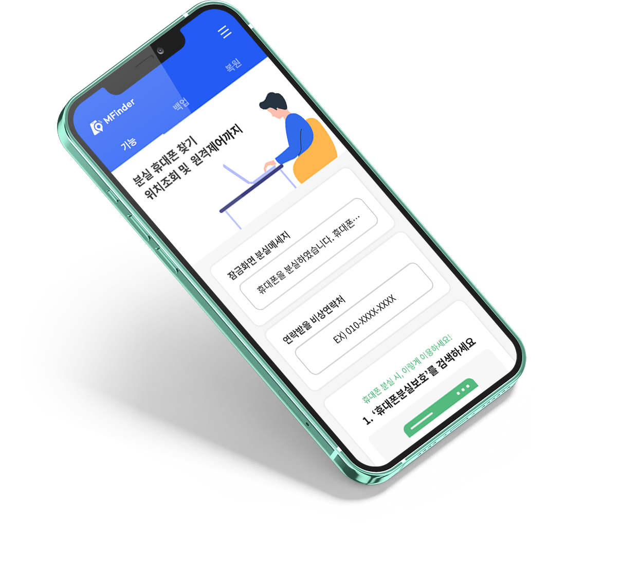 휴대폰분실보호(MFinder)는 휴대폰을 잃어버린 경험이 있는 분들이라면 한 번쯤은 생각해 봤을 다양한 기능들을 제공합니다. 카메라 실행, 유심변경 감지, 위치조회, WIFI감지, 사이렌울리기 등 분실폰 회수 가능성을 높이기 위한 기능과 함께 데이터 백업, 복원, 삭제와 같은 정보 보호 기능을 제공합니다.